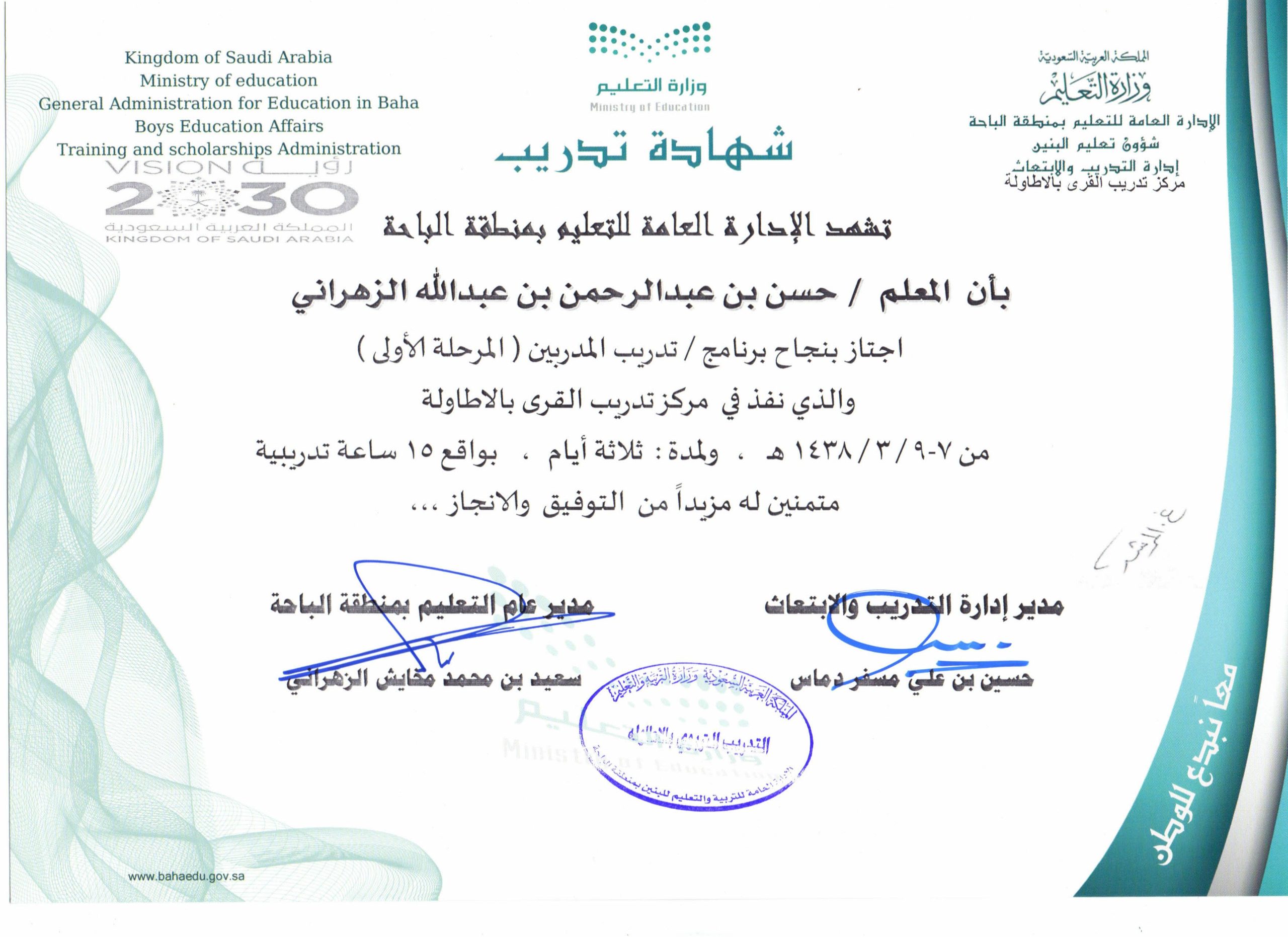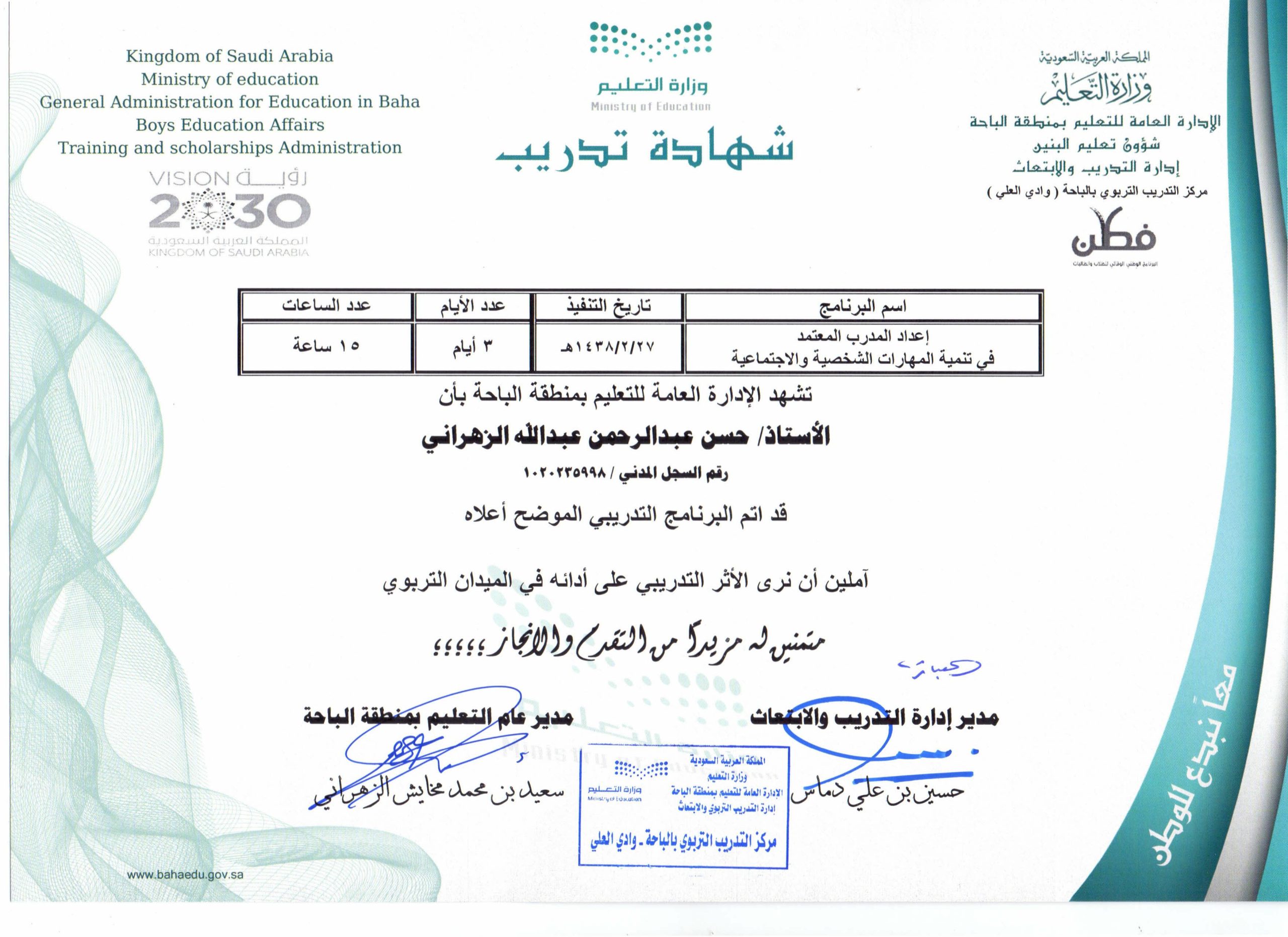 - مدرب معتمد من التعليم في تنمية المهارات الشخصية والاجتماعية ( 2017 )