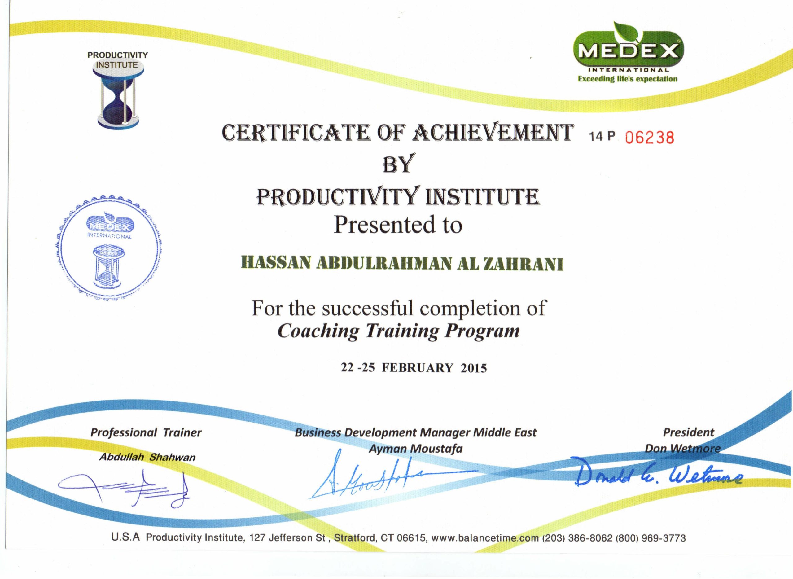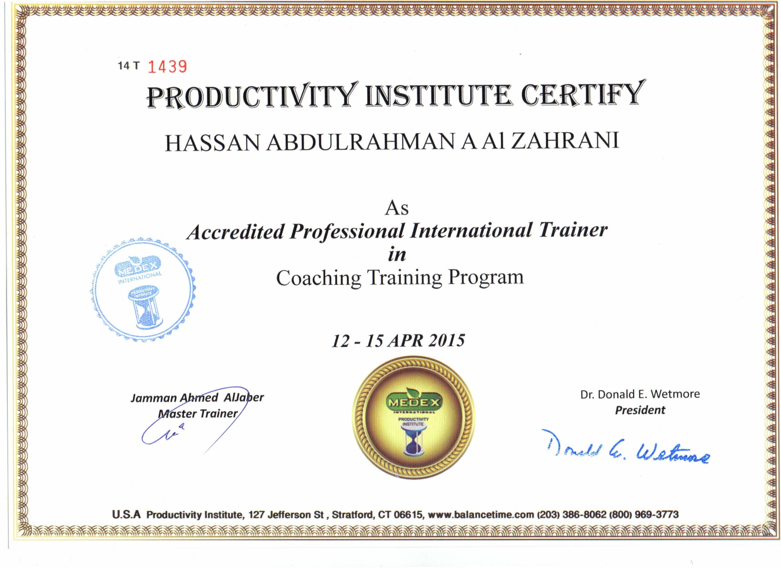 - مدرب وممارس معتمد للتوجيه الفعال ( الكوتشنج ) معهد الانتاجية الأمريكي MEDEX ميديكس ( 2015 )