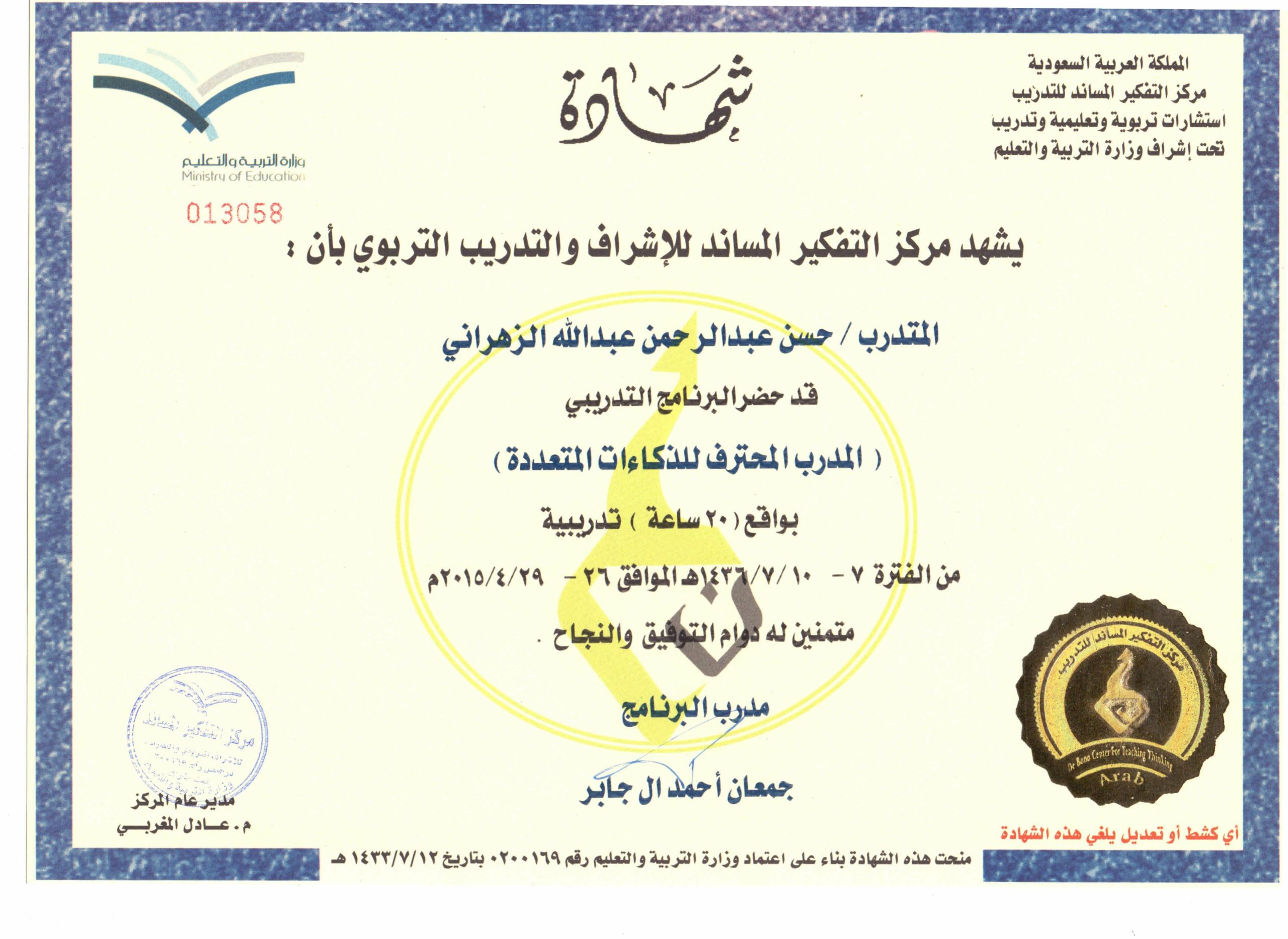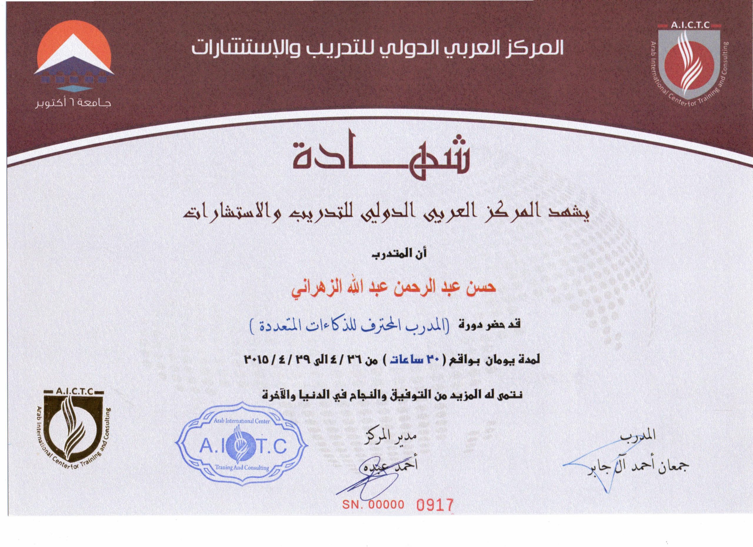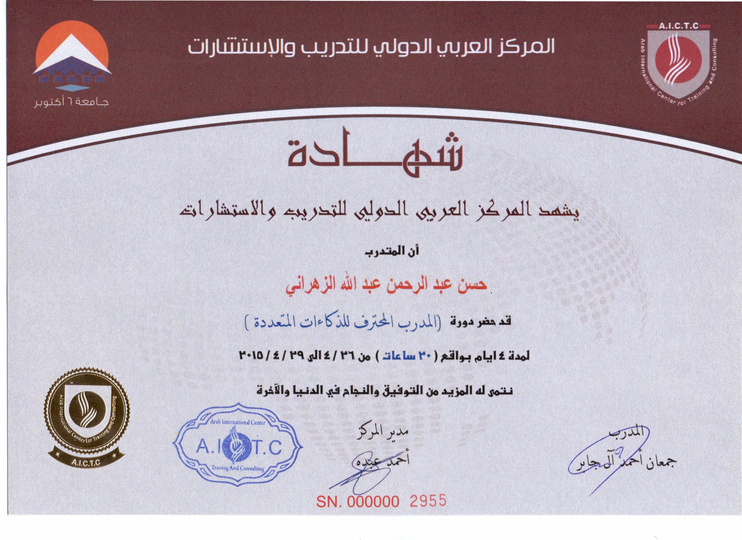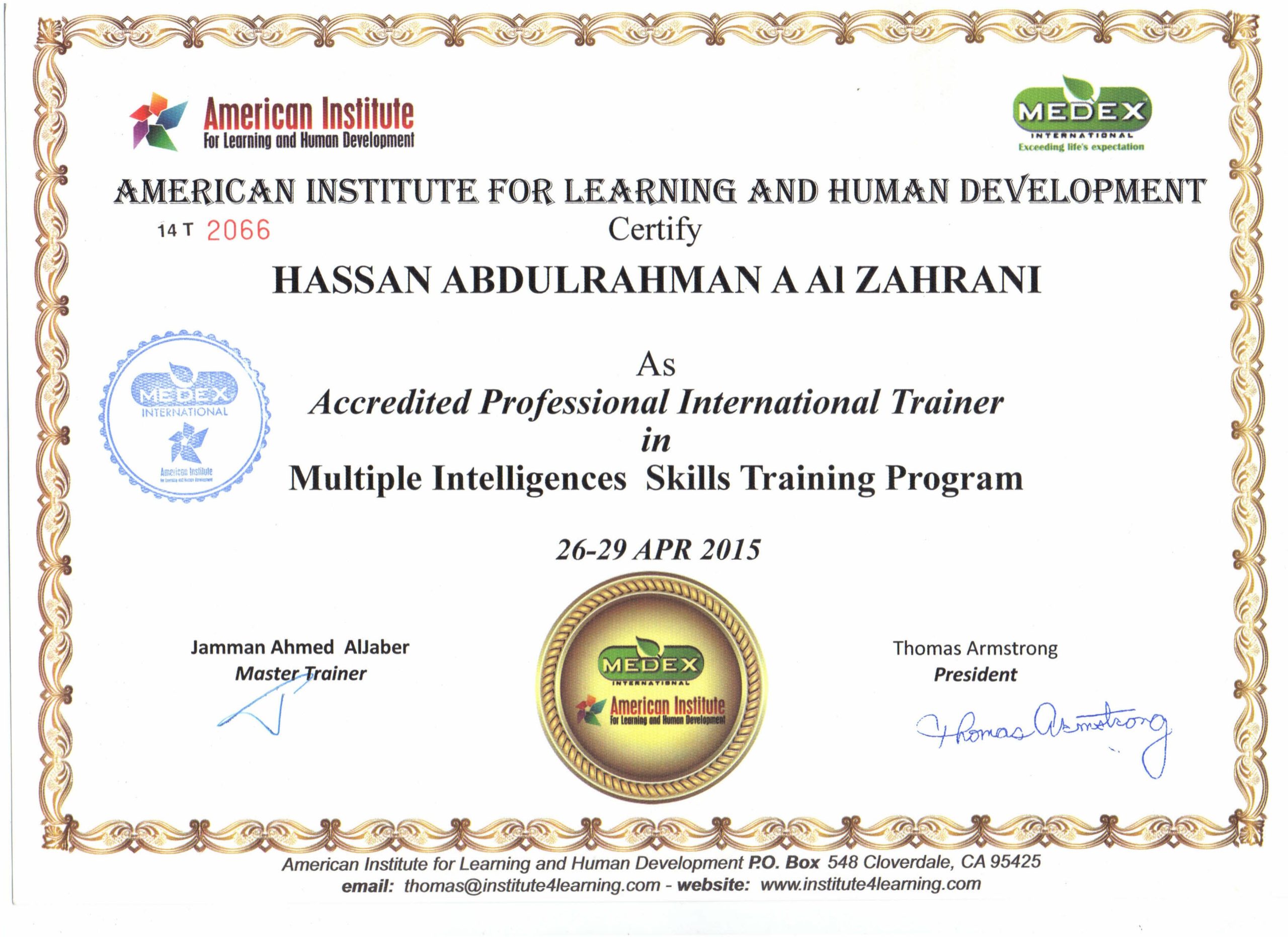 - مدرب معتمد للذكاءات المتعددة ( 2015 )