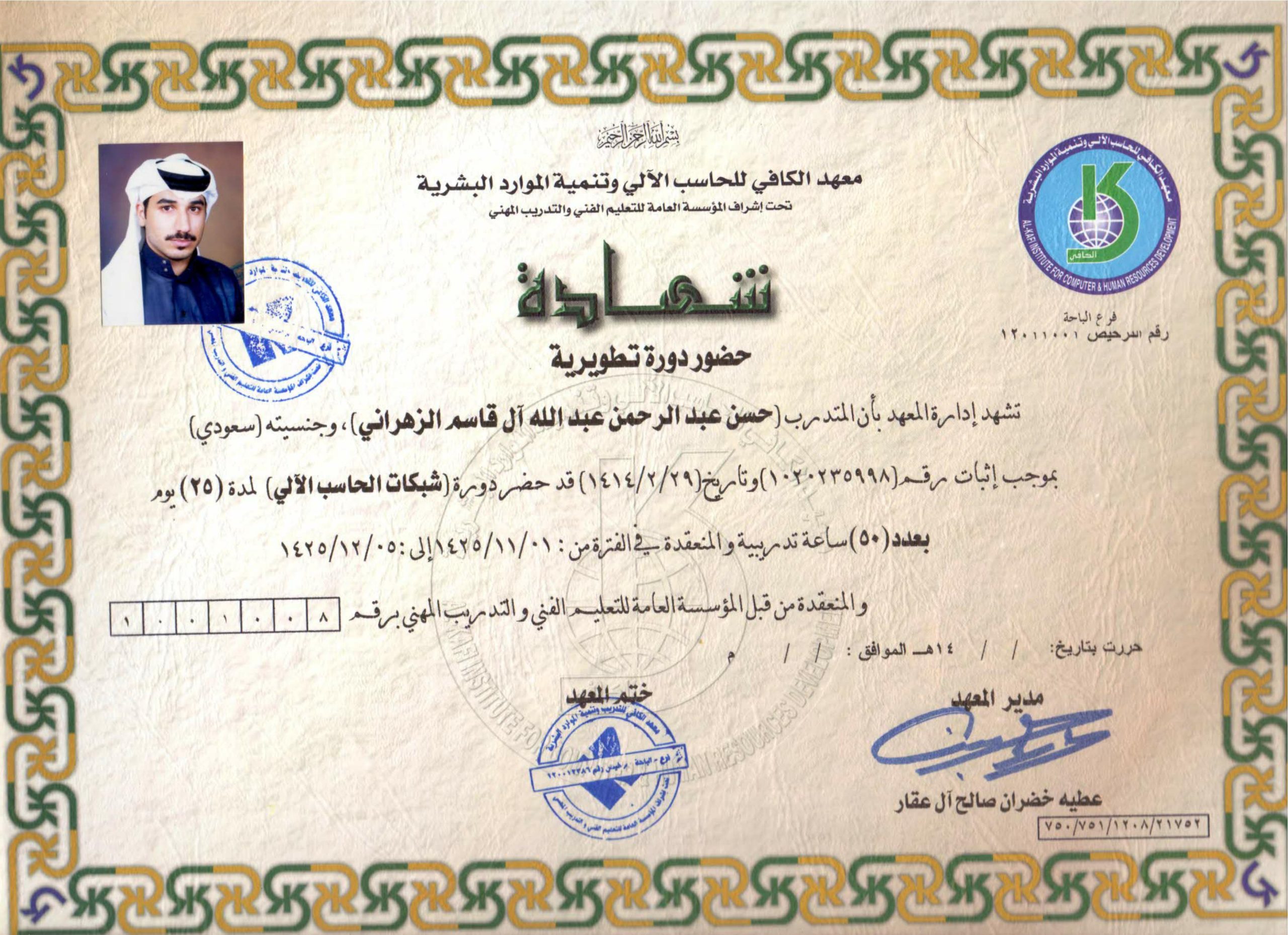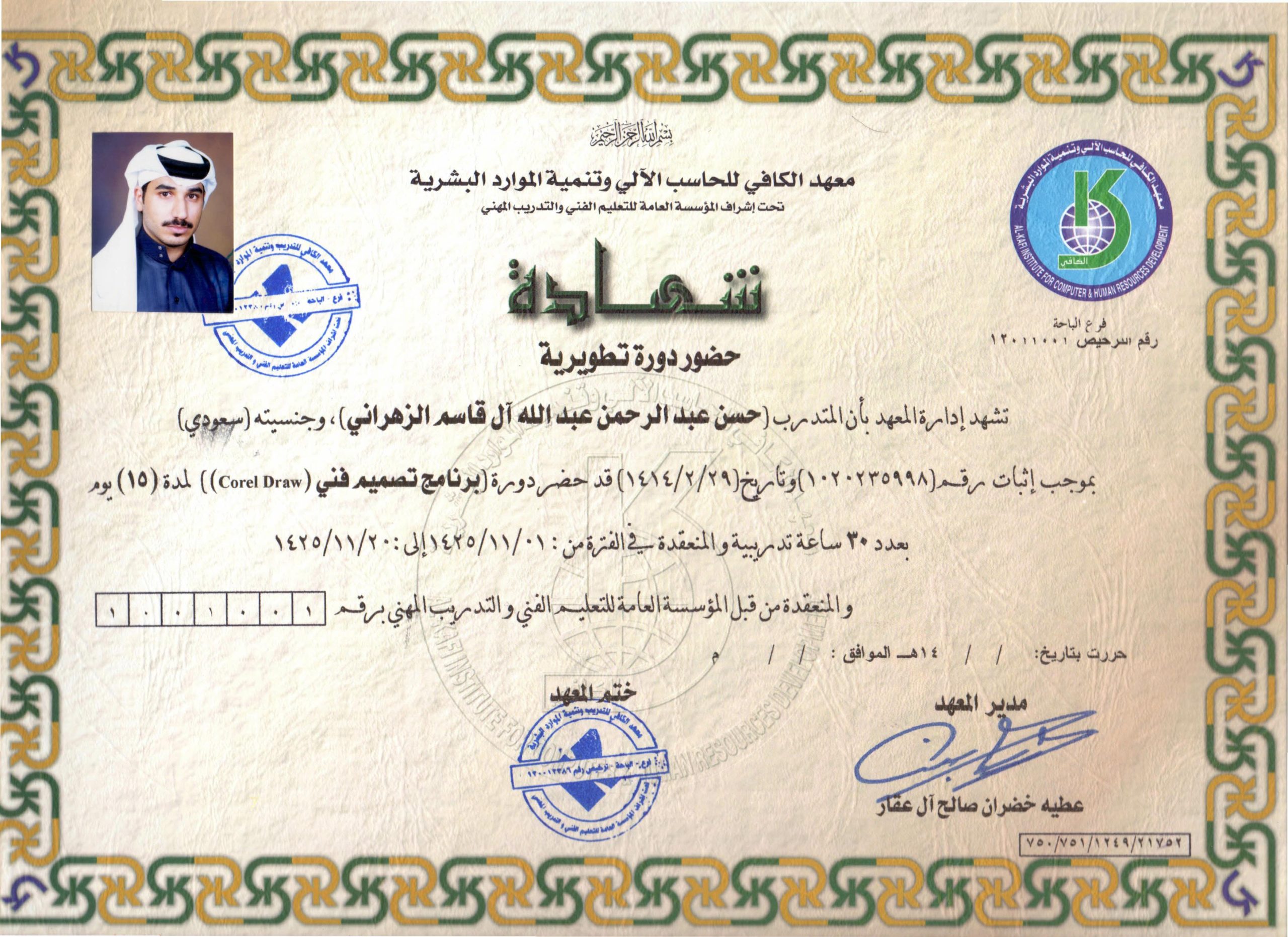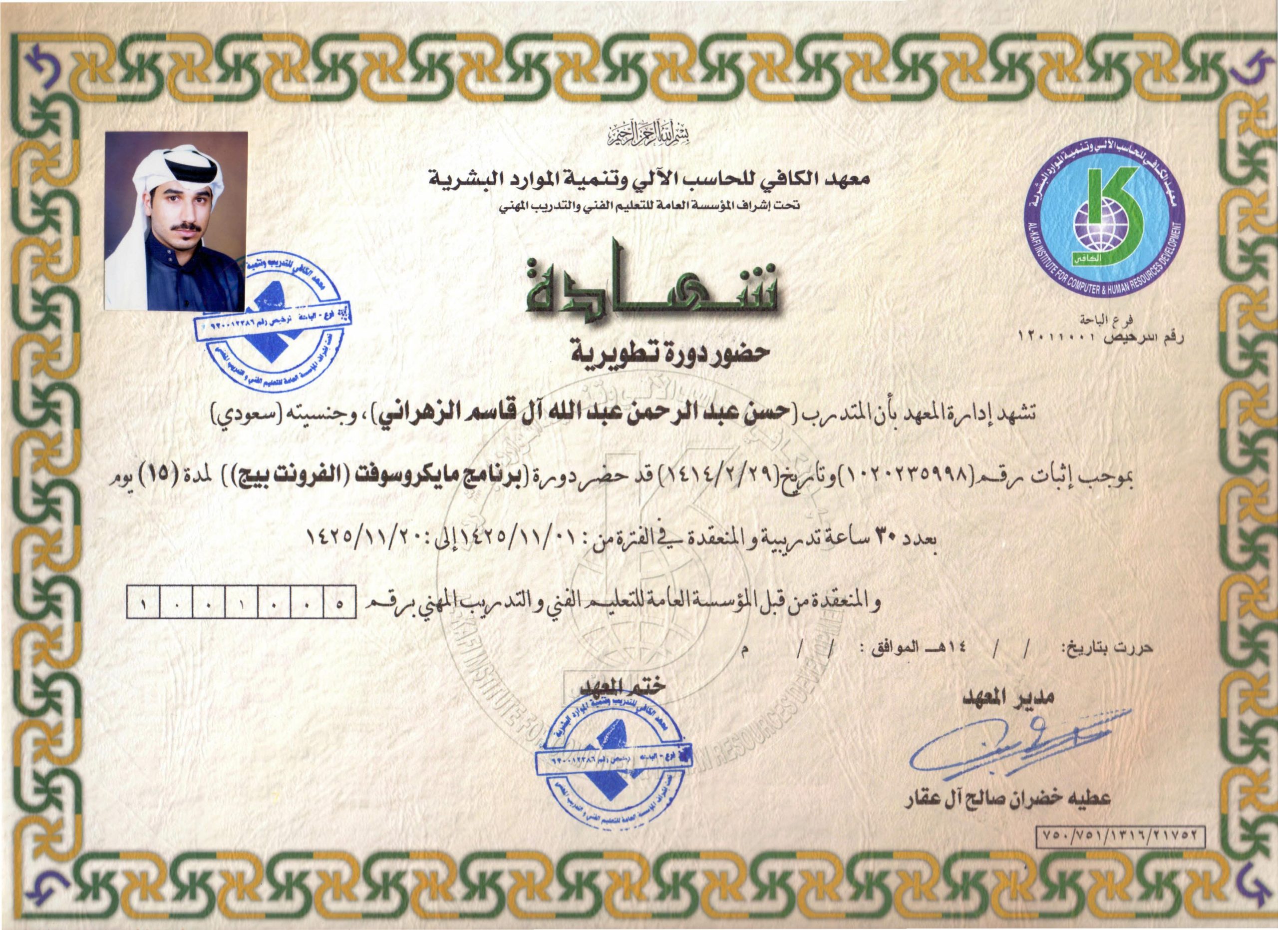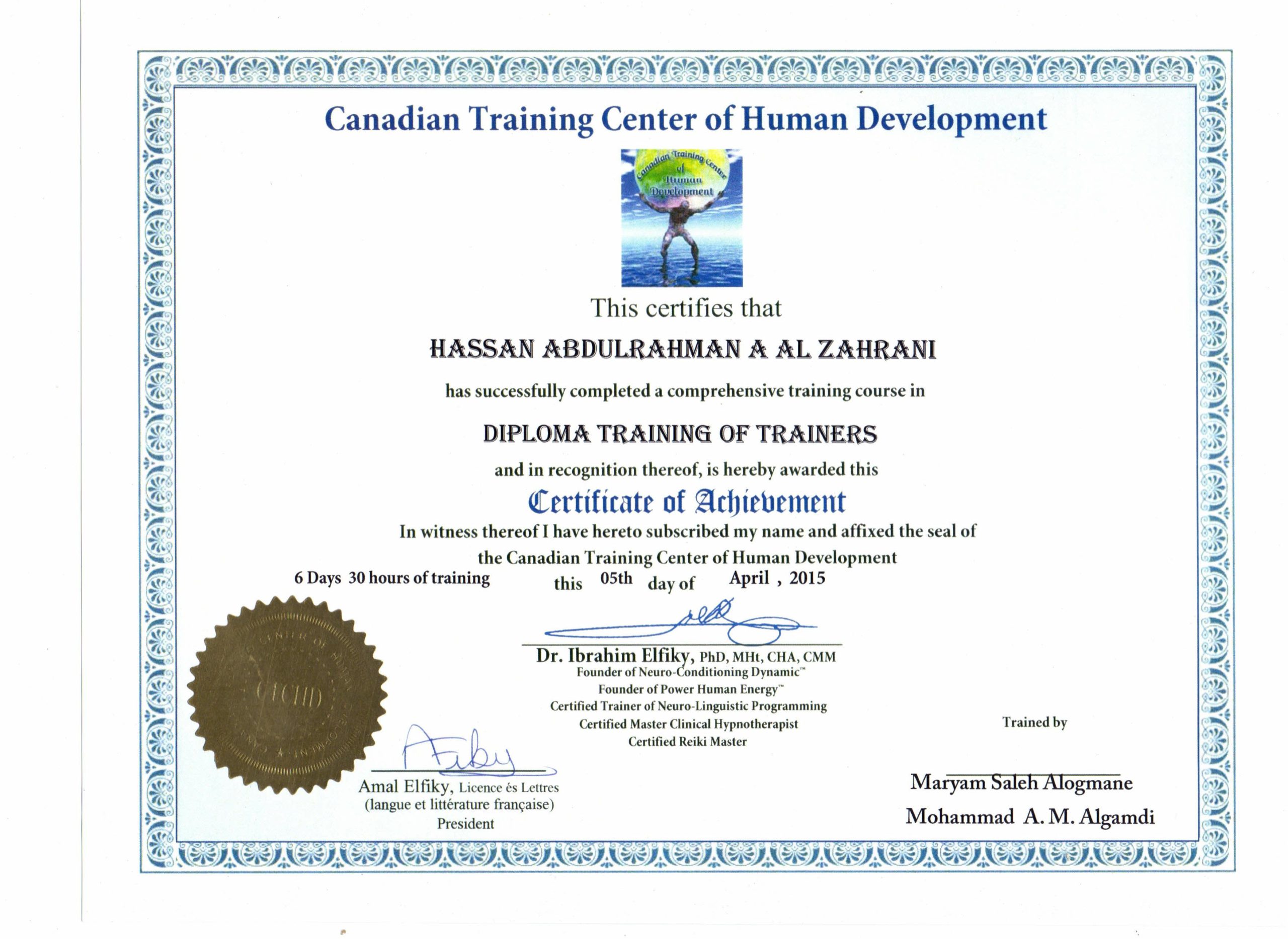 - مدرب مدربين معتمد من المركز الكندي للتدريب والتنمية البشرية ( 2015 )