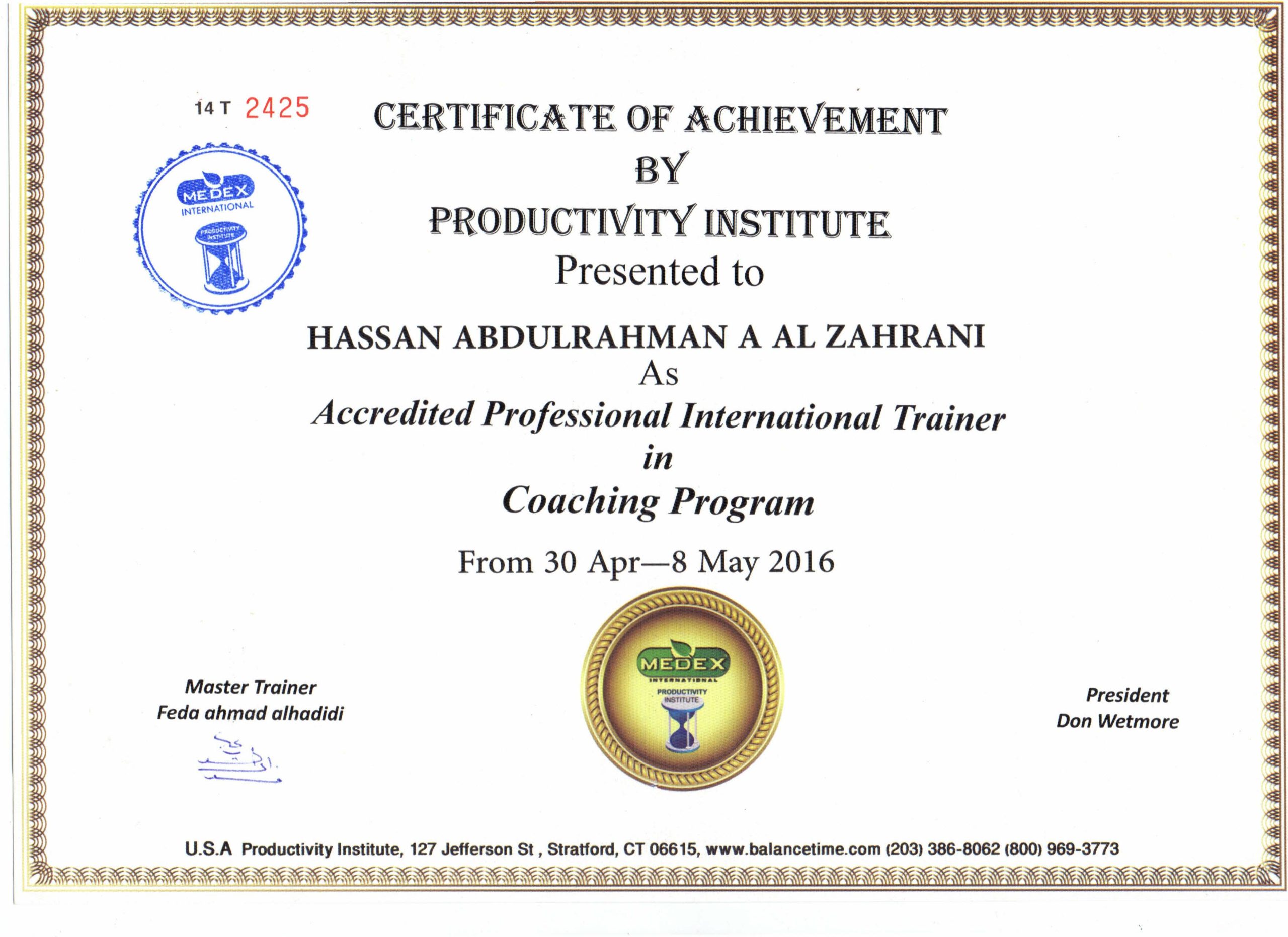 - مدرب وممارس معتمد للتوجيه الفعال ( الكوتشنج ) معهد الانتاجية الأمريكي MEDEX ميديكس ( 2016 )