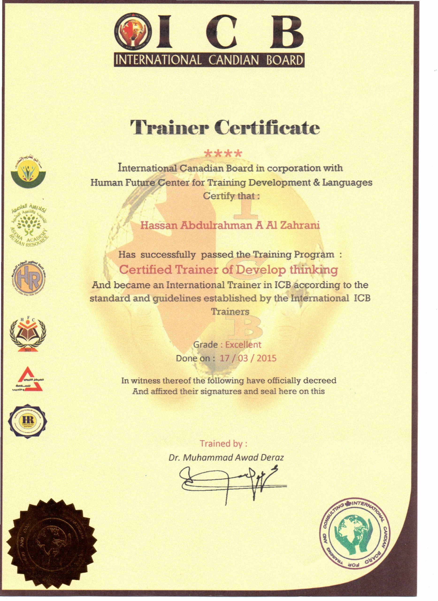 - مدرب معتمد من مجلس البورد الكندي لبرنامج استراتيجيات تنمية التفكير ( 2015 )