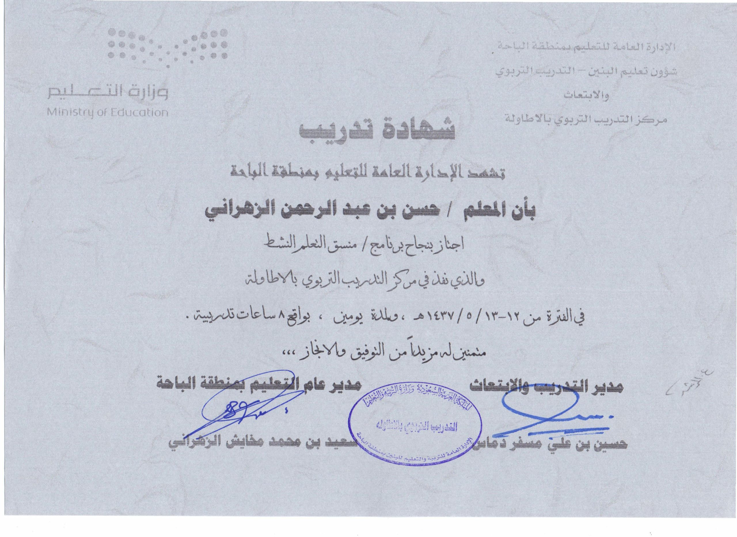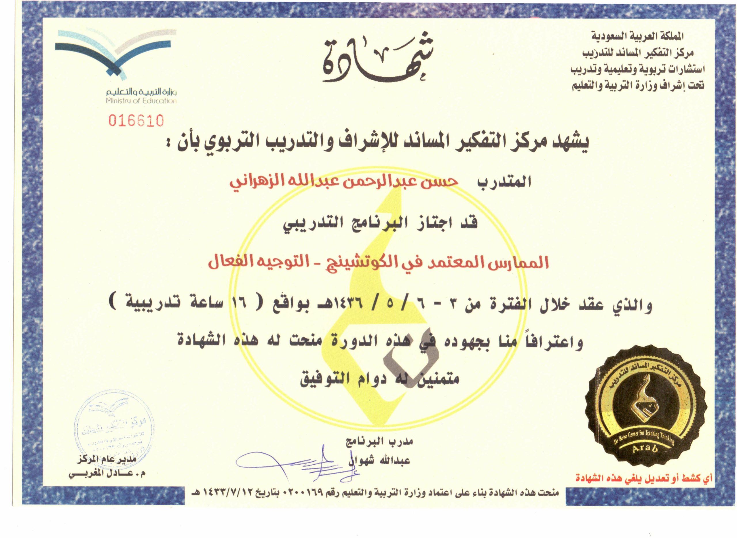 - ممارس معتمد من وزارة التعليم للتوجيه الفعال ( الكوتشنج ) 1436