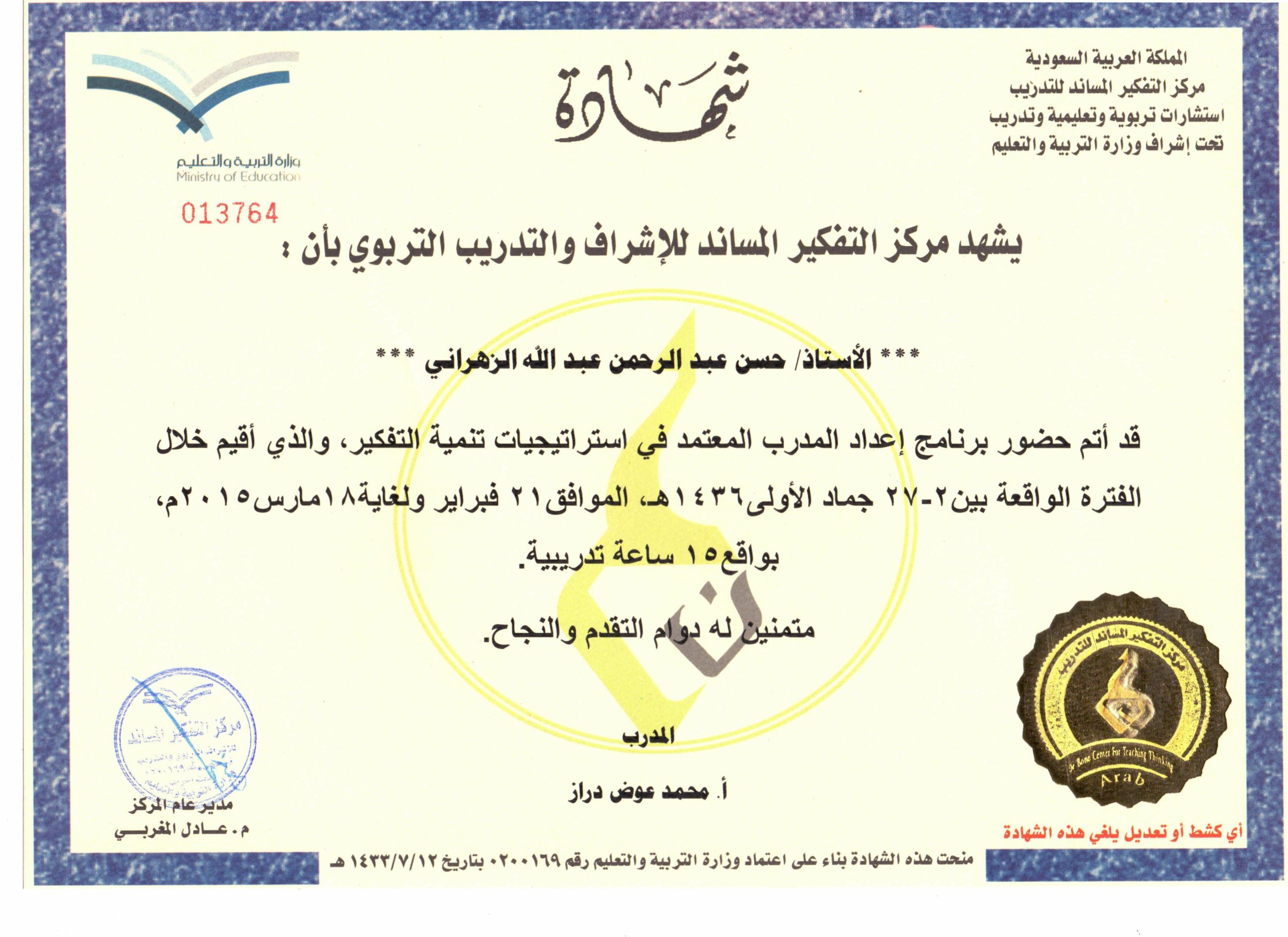 - مدرب معتمد لبرنامج استراتيجيات تنمية التفكير ( 2015 )