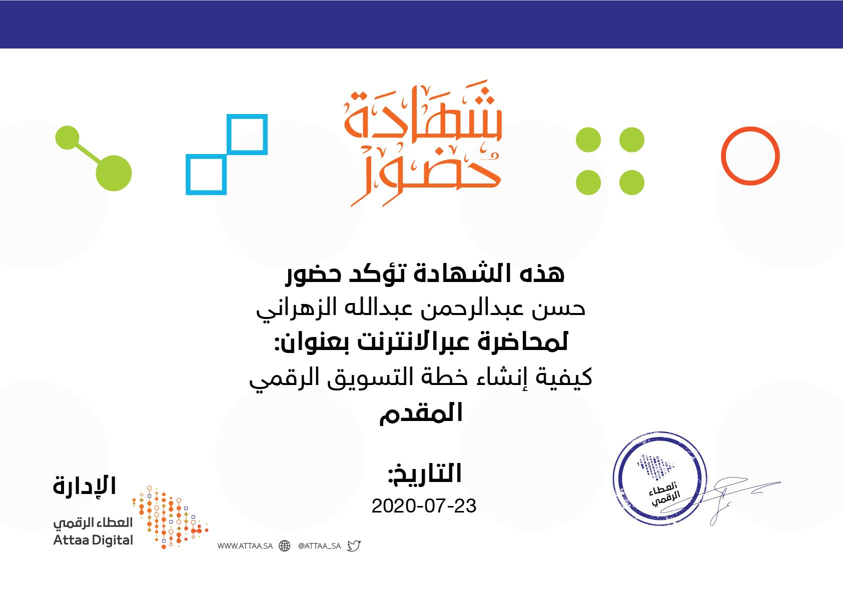 - محاضرة عبر الانترنت بعنوان ( كيفية إنشاء خطة التسويق ) – العطاء الرقمي ( 2020 )