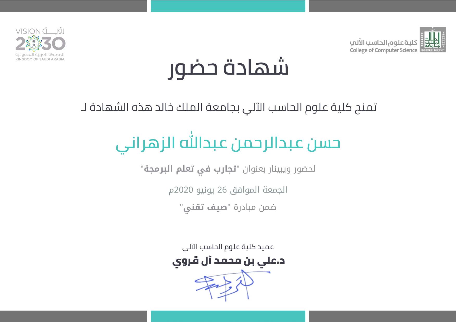 - ويبينار ” تجارب في تعليم البرمجة ” كلية علوم الحاسب الآلي بجامعة الملك خالد ( 2020 )