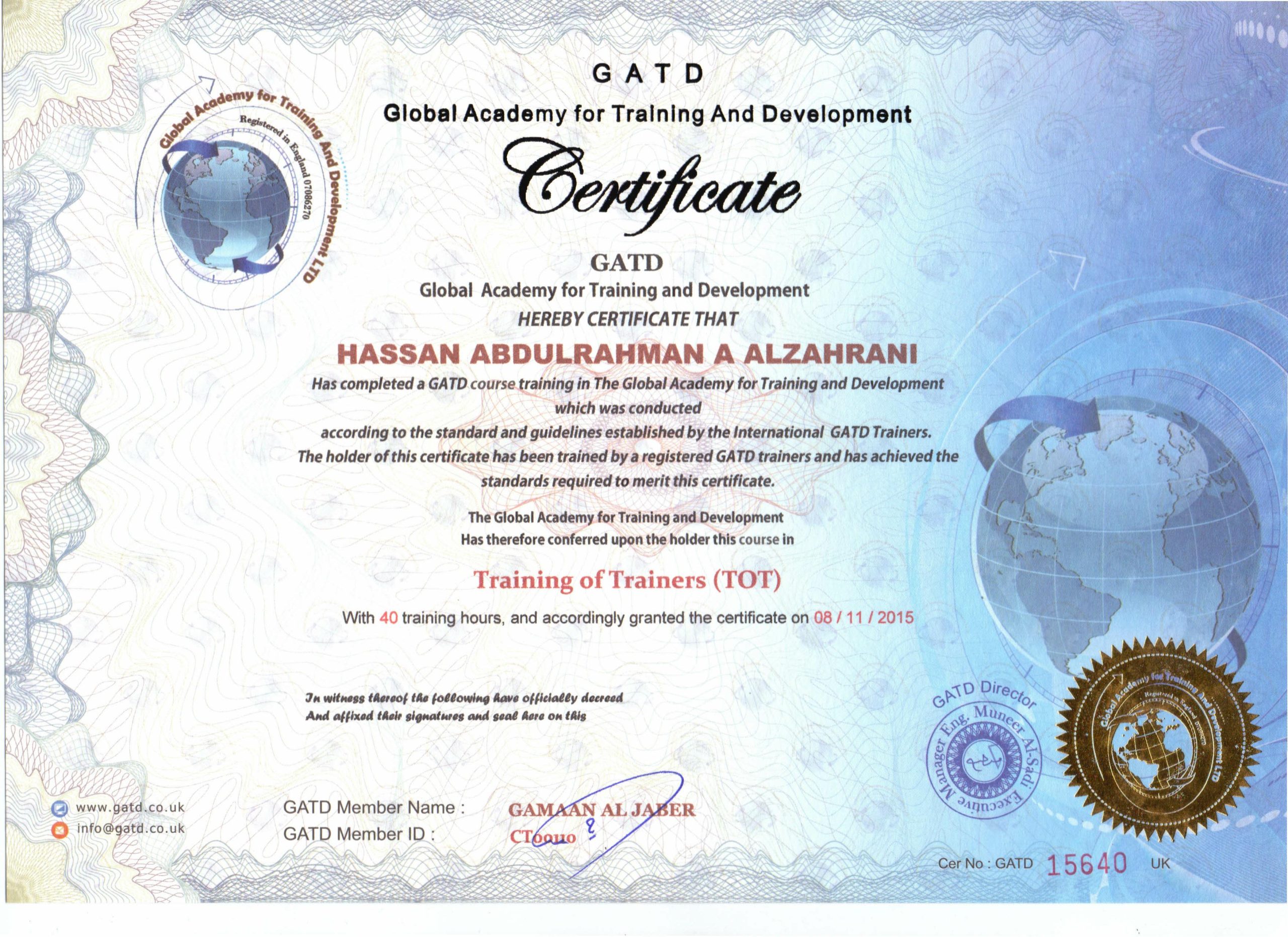 - مدرب معتمد من الأكاديمية العالميةللتدريب والتطوير البريطانية GATD