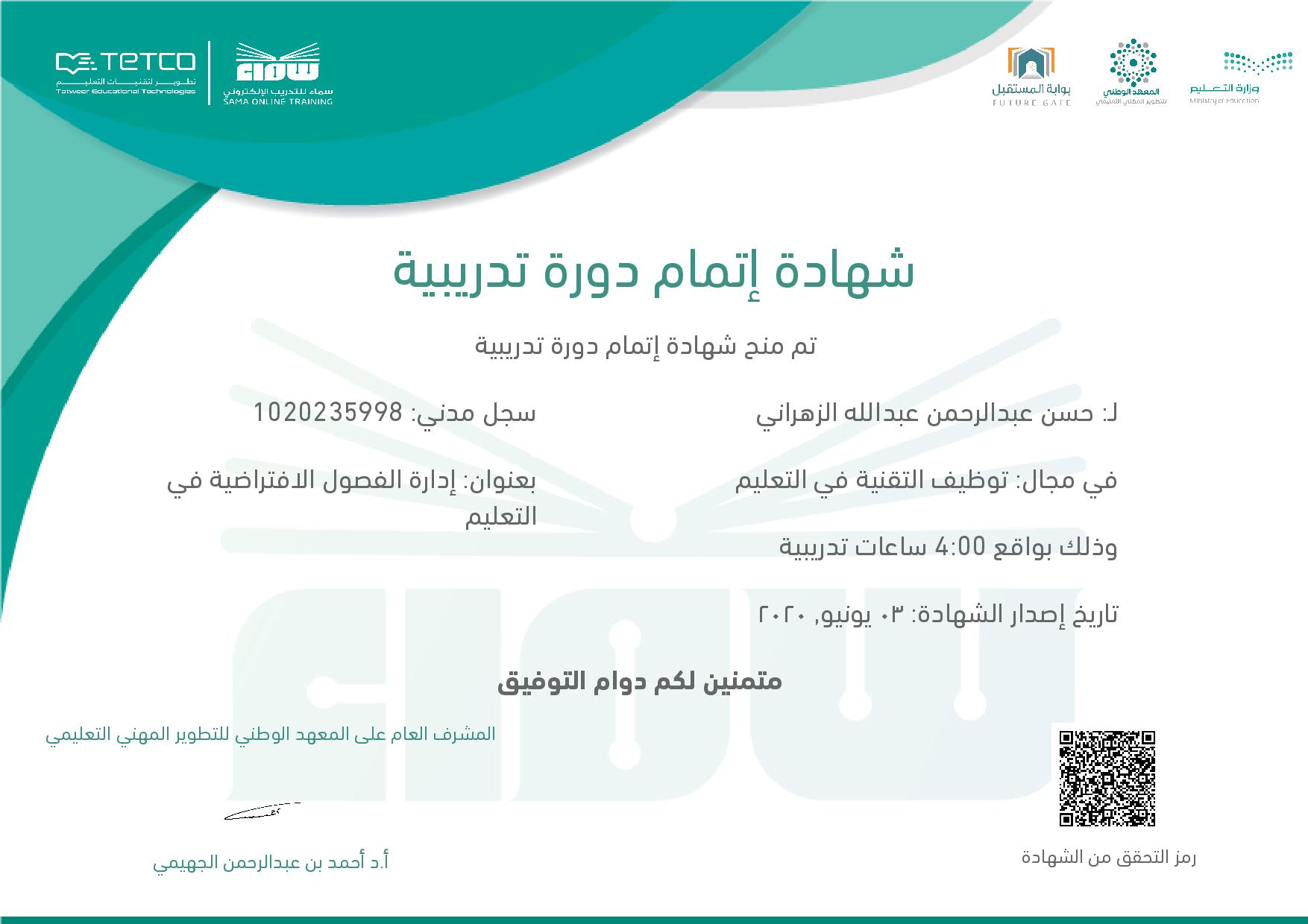 - دورة الإشراف الفعال – معتمدة من المؤسسة العامة للتدريب التقني والمهني 1440