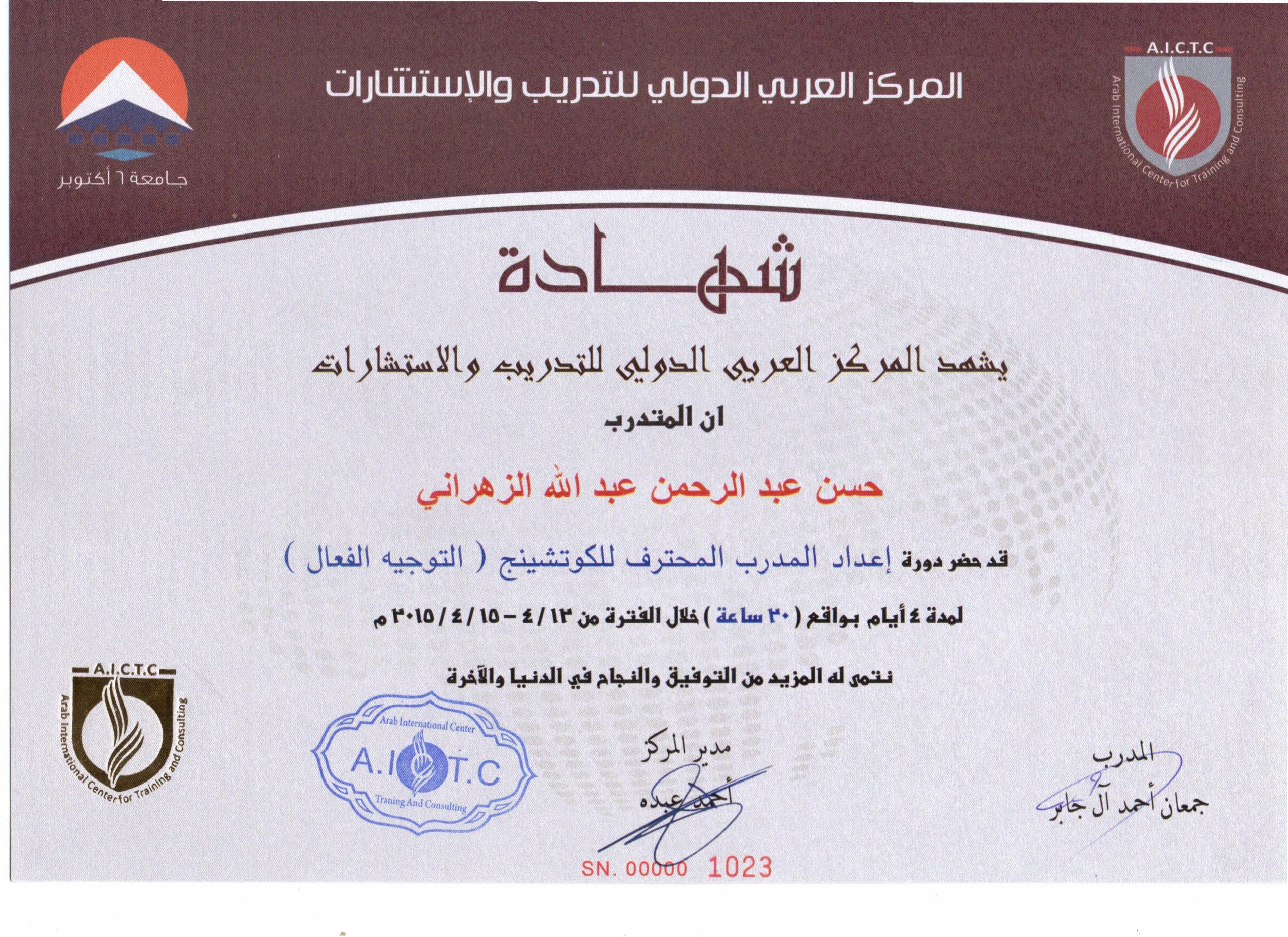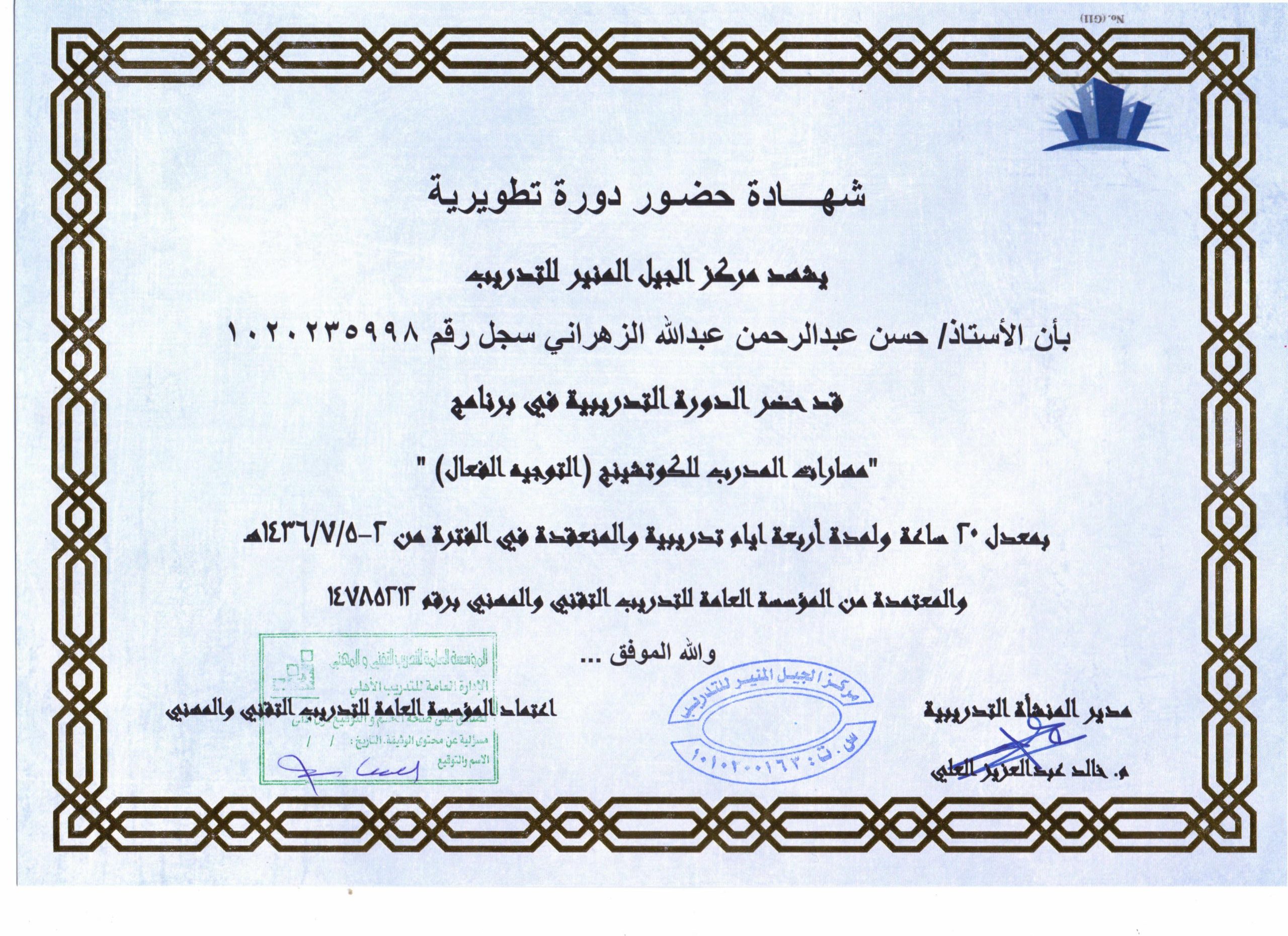 - مهارات مدرب معتمد للتوجيه الفعال ( الكوتشنج ) من المؤسسة العامة للتدريب الفني والتقني ( 2015 )