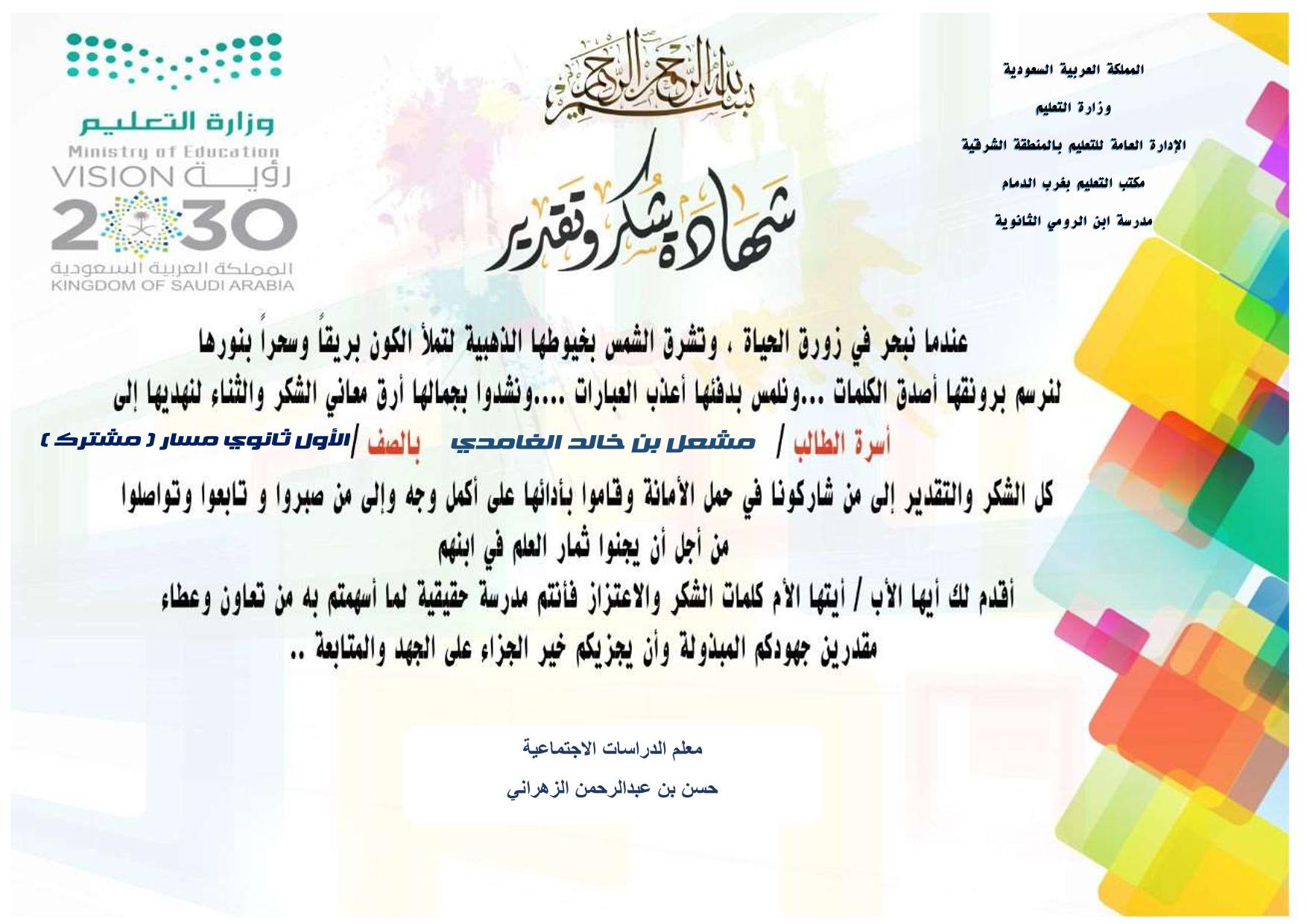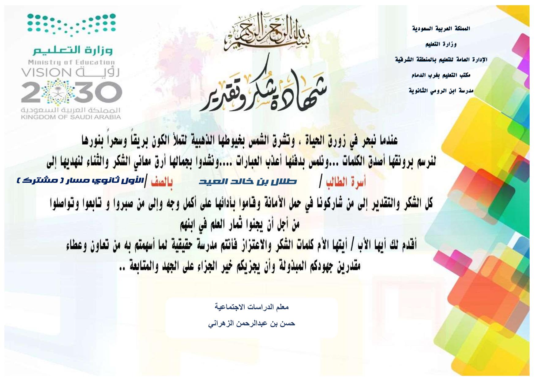 وقبل الختام أشكر من كان داعماً لك بدراستك لتكون روحا جميلة لحصص مادة ( الدراسات الاجتماعية ) لهذ الفصل بحضورك و مشاركاتك بهدوئك وازعاجك بنقاشاتك وجدالك فأنت بالفعل روح رائعة وكلي أمل أن أسعد بمادة أخرى بالمستقبل تكون أحد الدارسين بها واسأل الله لك التوفيق دوما وأن تسعد بتحقيق جميع أهدافك وتكون كما تحب وكما يرجو والديك .