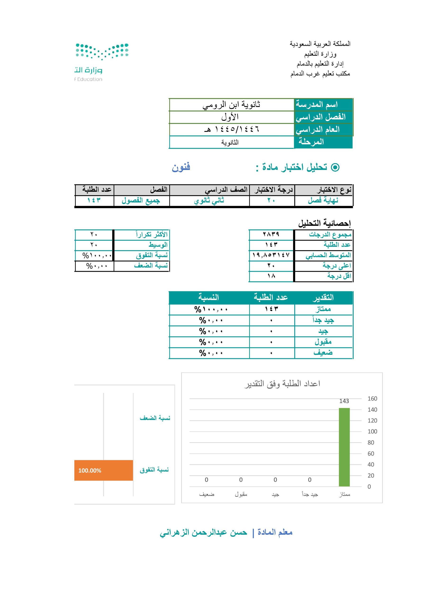 تحليل نتائج المواد الدراسية التي يقوم بتدريسها المعلم يقوم الملف باستخراج متوسط الدرجات وأعلى أو أقل درجة على حصليها الطلاب كما يوقم بعرض عدد الطلاب الحاصلين على تقدير ممتاز أو جيد جداً أو جيد والنسبة المئوية.
